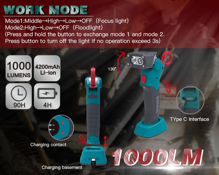 | Work Mode | Mode1:Middle→High→Low→OFF(Focus light) Mode2:High→Low→OFF(Floodlight) (Press and hold the button to exchange mode 1 and mode 2. Press button to turn off the light if no operation exceed 3s) |
